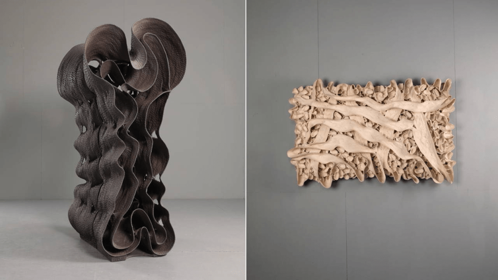 Duvar yerleştirmelerinde organik bir çoğalma hissi belirgin. Kemiksi ve kabuksu çağrışımlar taşıyan, biyomorfik özellikler gösteren modüler yüzeyler; doğanın büyüme ritmini, tortulaşmayı ve zamana yayılan emeği anımsatıyor. Eserler bulundukları mekâna göre genişleyen bir ifade geliştiriyor; adeta yerleştikleri zemine yeniden kök salıyor.