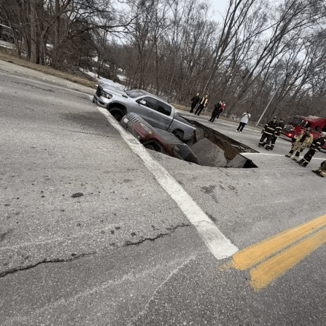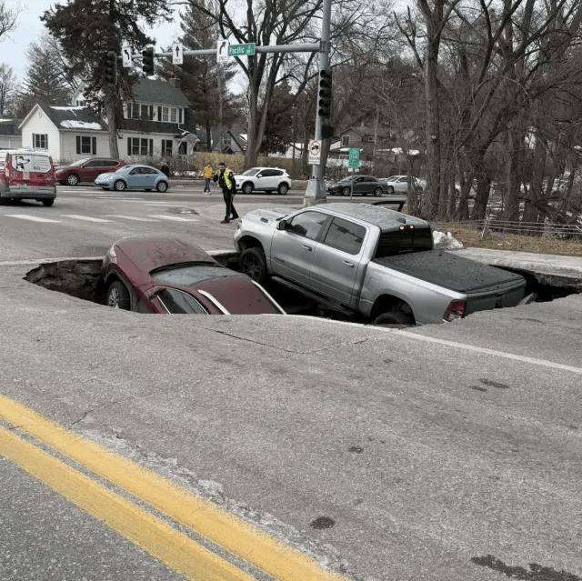 ABD’nin Nebraska eyaletine bağlı Omaha şehrindeki bir kavşakta yolun aniden içine çökmesiyle kırmızı ışıkta bekleyen iki otomobil oluşan çukura düştü.