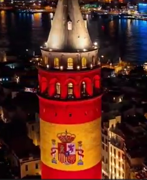 Türkiye ile İspanya arasındaki diplomatik yakınlaşma ve karşılıklı jestler, İstanbul’un tarihi simgesi Galata Kulesi’ne yansıtılan görsel şölenle taçlandırıldı. Gece saatlerinde iki ülkenin bayrak renklerine bürünen tarihi kule, yerli ve yabancı turistlerin ilgi odağı oldu.