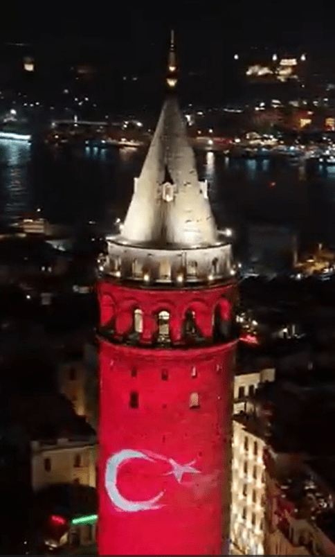 Havadan kaydedilen görüntülerde, Galata Kulesi’nin gövdesinin önce İspanya bayrağının renklerine büründüğü, ardından üzerinde resmi devlet armasının belirdiği görüldü. Hemen sonrasında ise kule, Türk bayrağının ay-yıldızlı kırmızı-beyaz renklerine geçiş yaparak izleyenlere etkileyici anlar yaşattı. Meydanda toplanan vatandaşlar ve turistler, bu anları cep telefonlarıyla kaydederek sosyal medyada paylaştı.