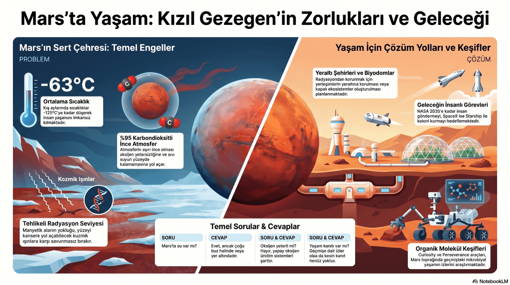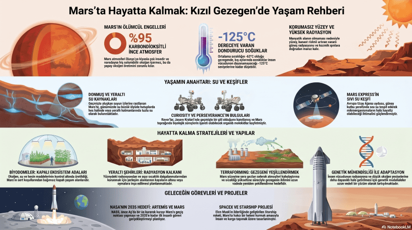 Uzayın sonsuzluğunda insanlığın en büyük hayallerinden biri olan Mars’a yerleşmek, yayınlanan yeni nesil infografik tasarımlarıyla bir kez daha gözler önüne serildi. Peki, korumasız bir insanın doğal koşullarda “yaşama oranının %0” olduğu bu ölümcül gezegende insanlık nasıl hayatta kalacak?